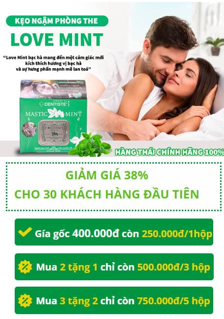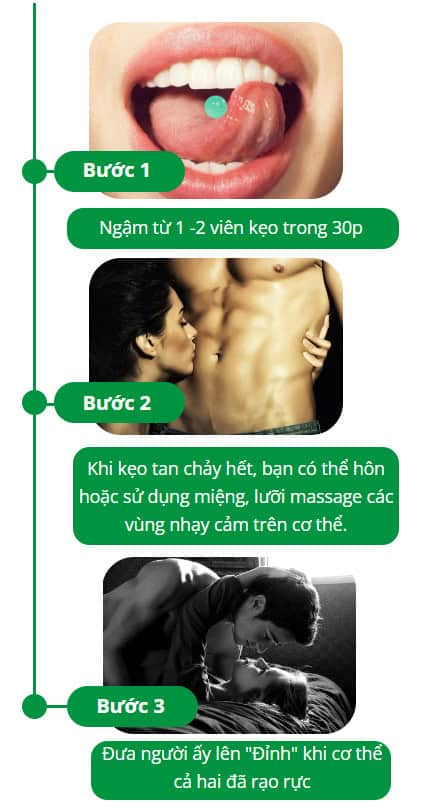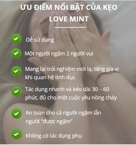 Kẹo ngậm Love Mint là lựa chọn hoàn hảo cho các cặp đôi muốn làm mới đời sống chăn gối. Được xem như “bí kíp nhỏ” trong các cuộc vui, chỉ với 1-2 viên kẹo trước khi bắt đầu, bạn sẽ mang đến trải nghiệm mãnh liệt, đầy hưng phấn cho đối phương. Hiệu quả kéo dài từ 30 – 60 phút, giúp tăng thêm hứng thú và duy trì không khí tươi mới suốt quá trình yêu thương.