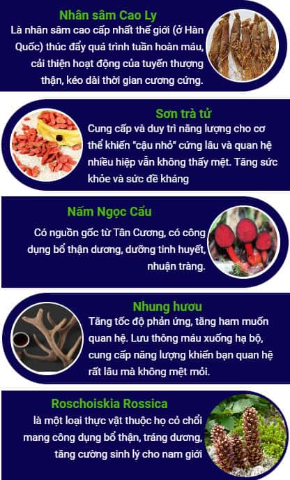 Hỗ trợ cải thiện tình trạng xuất tinh sớm, cải thiện tình trạng rối loạn cương dương, giúp tăng cường lưu thông máu đến bộ phận sinh dục Tăng cường sự khỏe khoắn, dẻo dai. Từ đó cải thiện kích thước dương vật, kéo dài thời gian quan hệ.